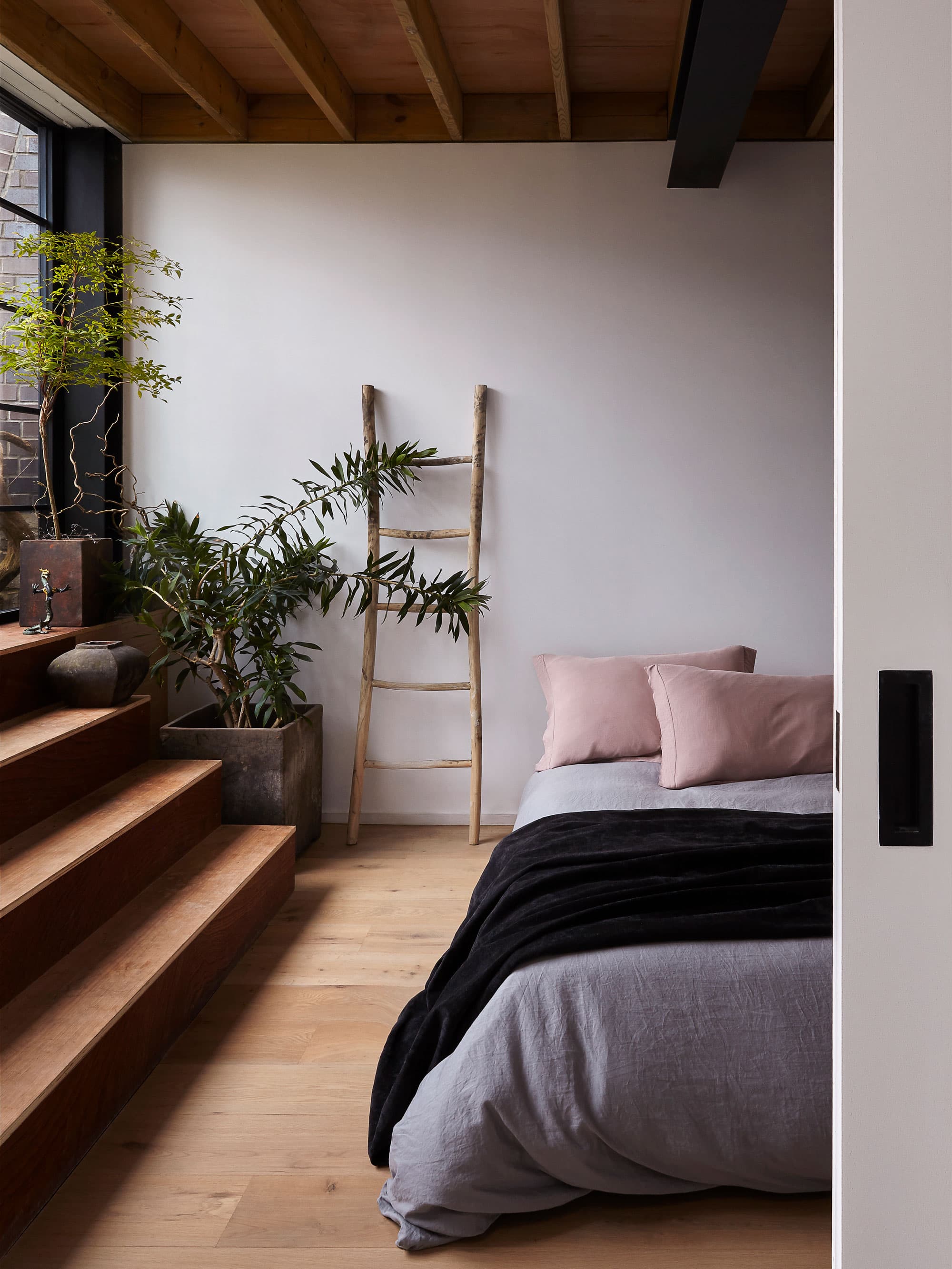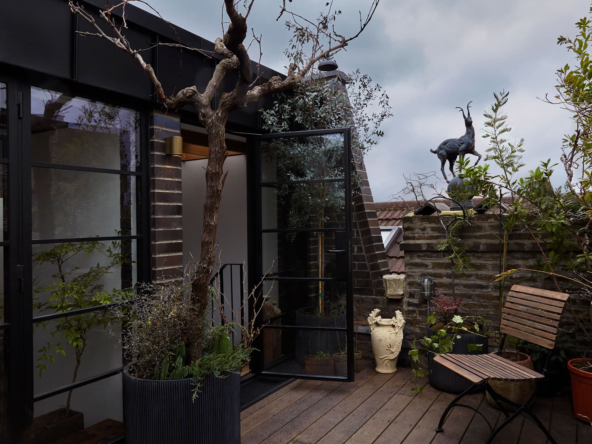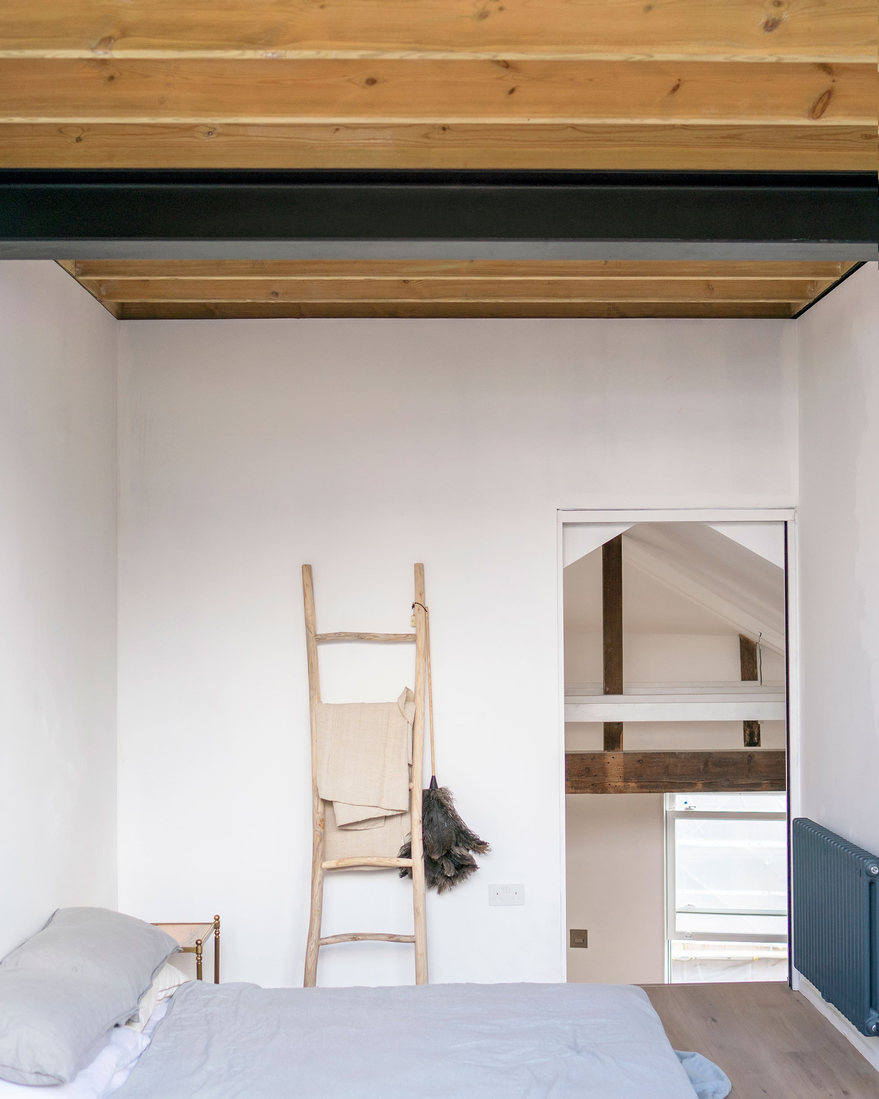 The Mare Street Conservation Area limits on the height of any extensions, so we took Will’s mezzanine as the starting point and carefully added a new t volume at the same level. The low level of the floor allowed generous ceiling heights for a new bedroom and bathroom space, with access to a discreet sunken roof terrace at the rear which is, connected to the original flat via a lightweight perforated metal staircase.
