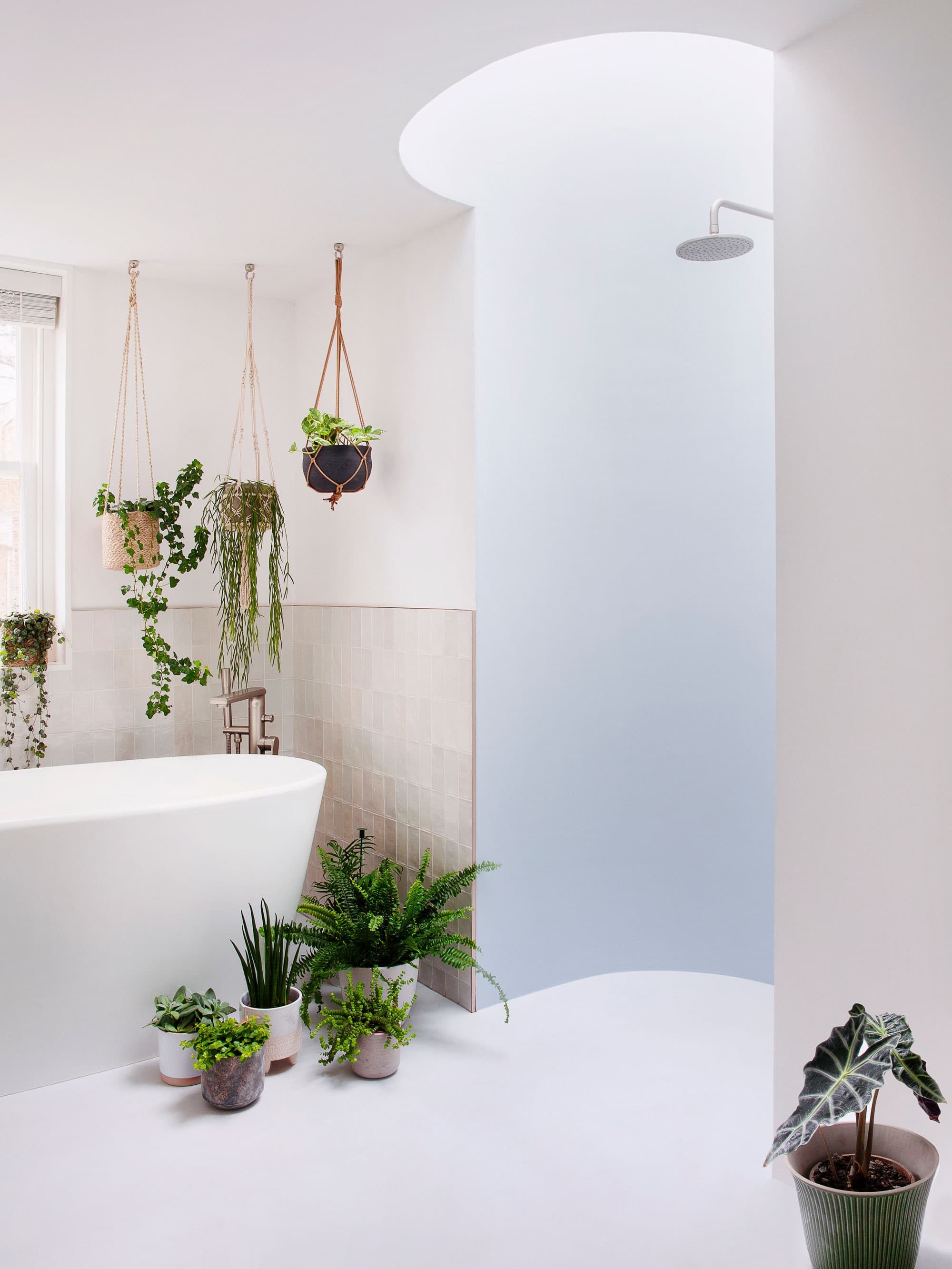 Contemporary materials were integrated throughout the period house to form unique living spaces. A curved stainless steel shower was projected from a two-storey extension, and an unusually deep bay window was added to the ground floor to create a rest and reading spot with a sweeping vista of the garden.