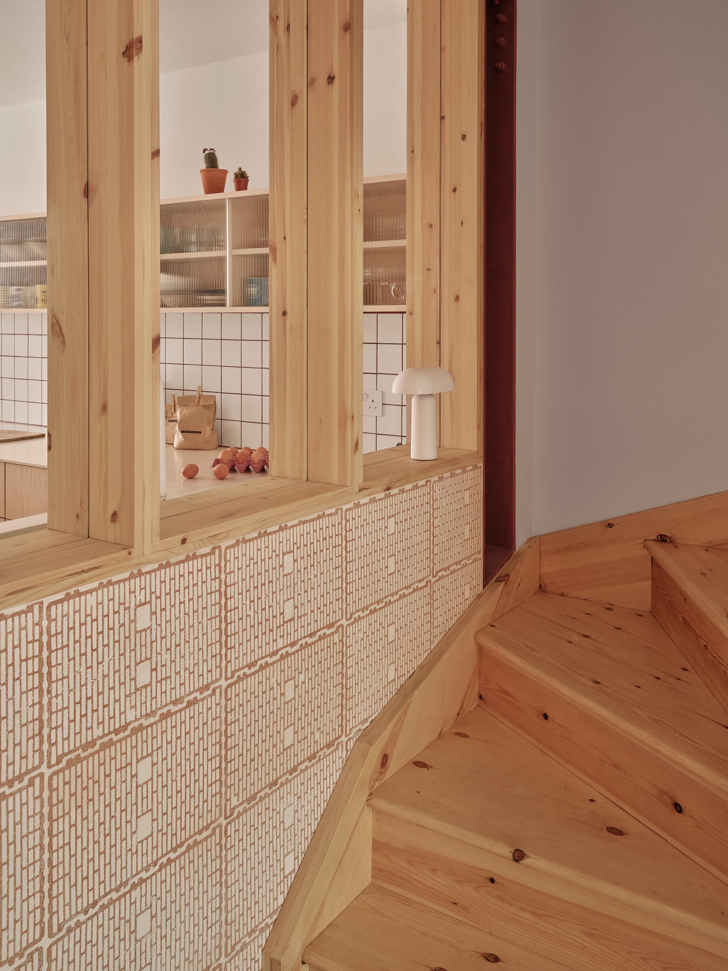 By building with Porotherm, we reduced the need for concrete, insulation, and internal linings. Its interlocking design simplified construction and helped minimise material use. Inside, the exposed blocks offer a raw, textural finish that complements the home’s original 1970s brickwork. Outside, we experimented with custom-cut tiles from the same blocks, reimagining their cellular form as a subtle decorative cladding.