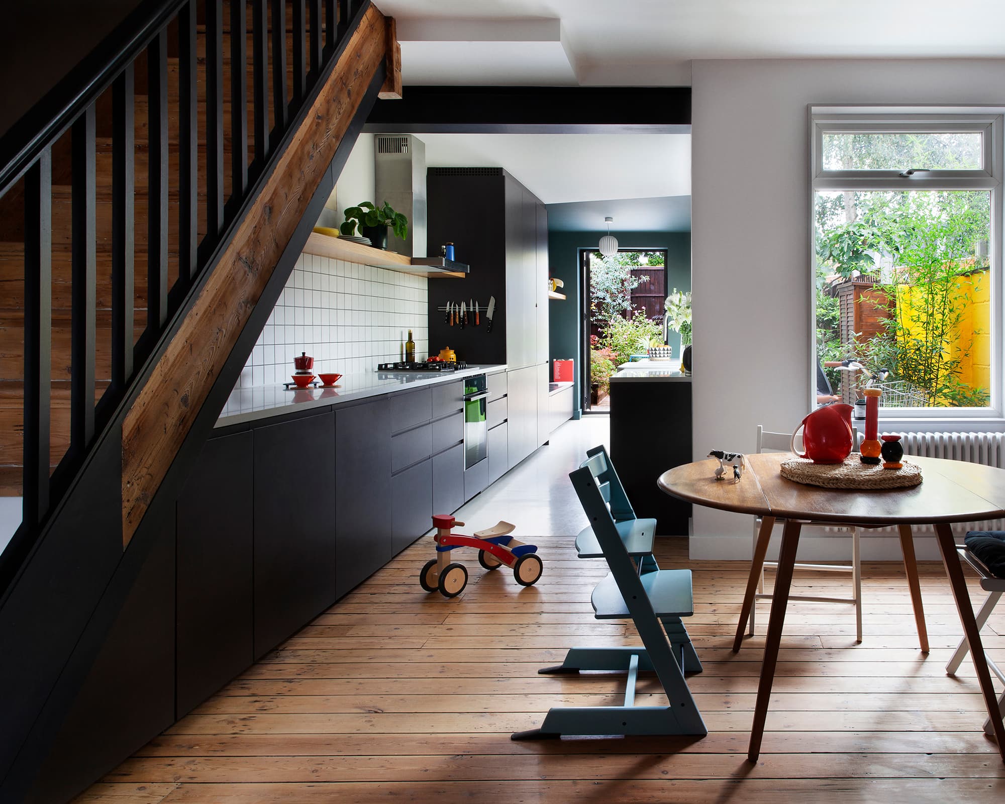 Large new openings were created at the end of the kitchen to create a snug garden room, leading out to the newly terraced space outside.