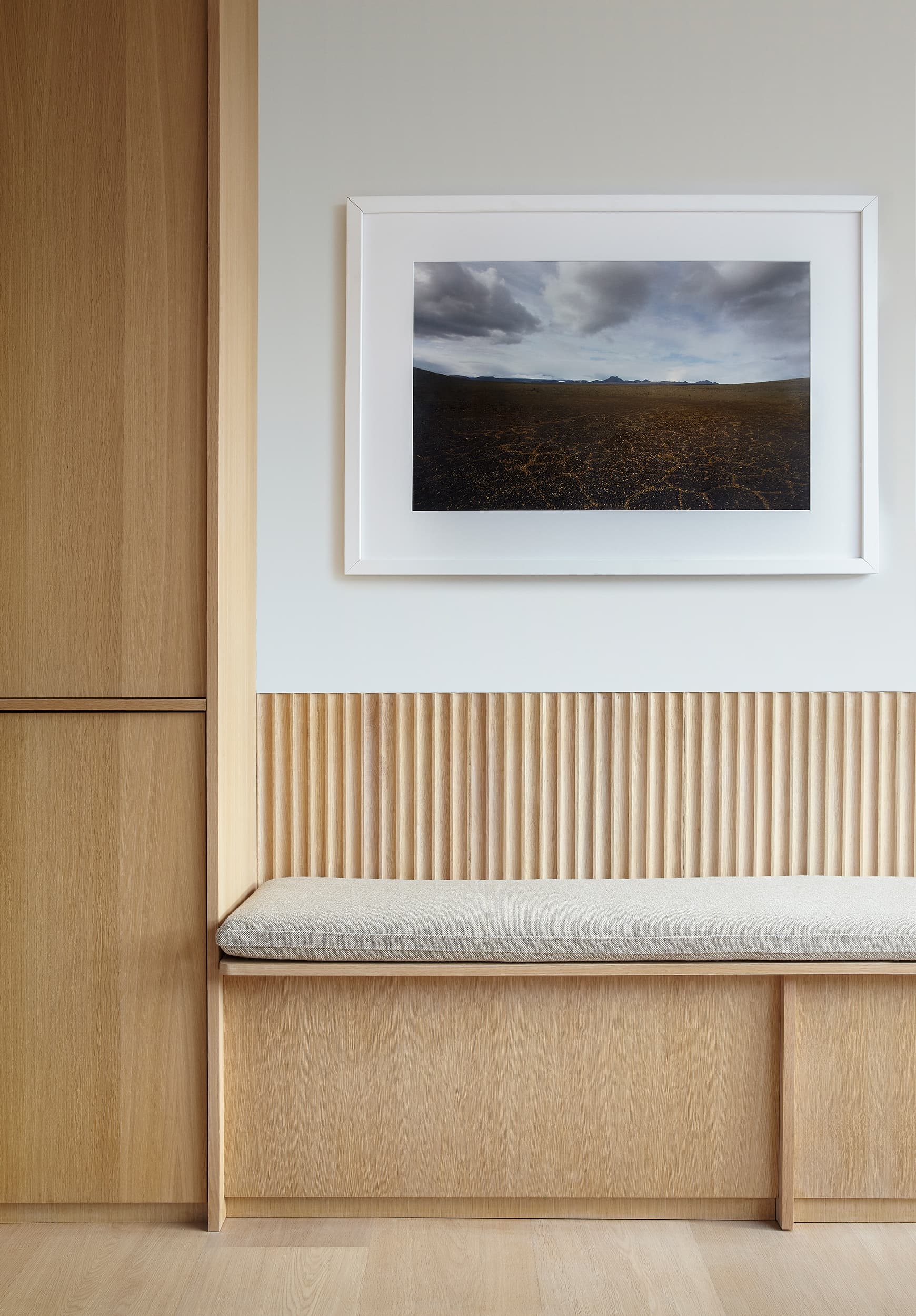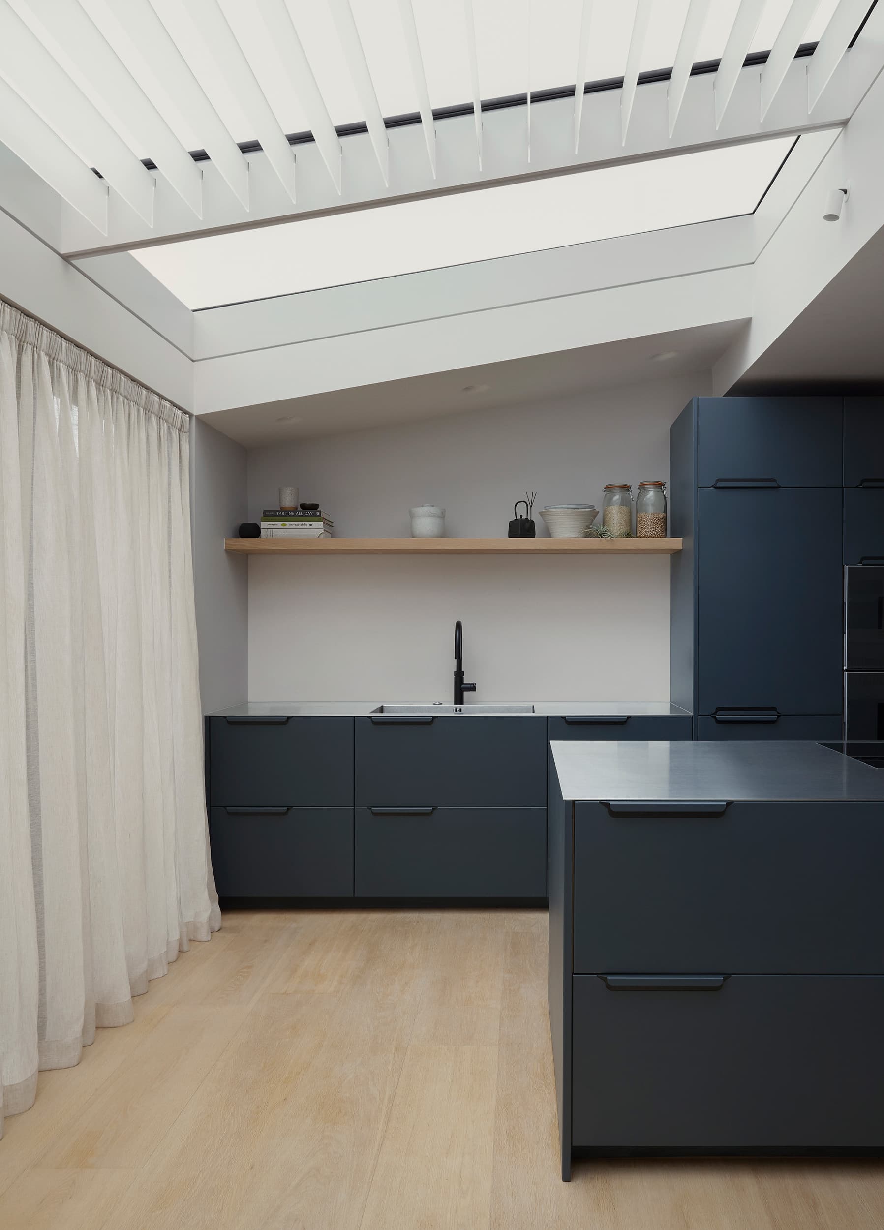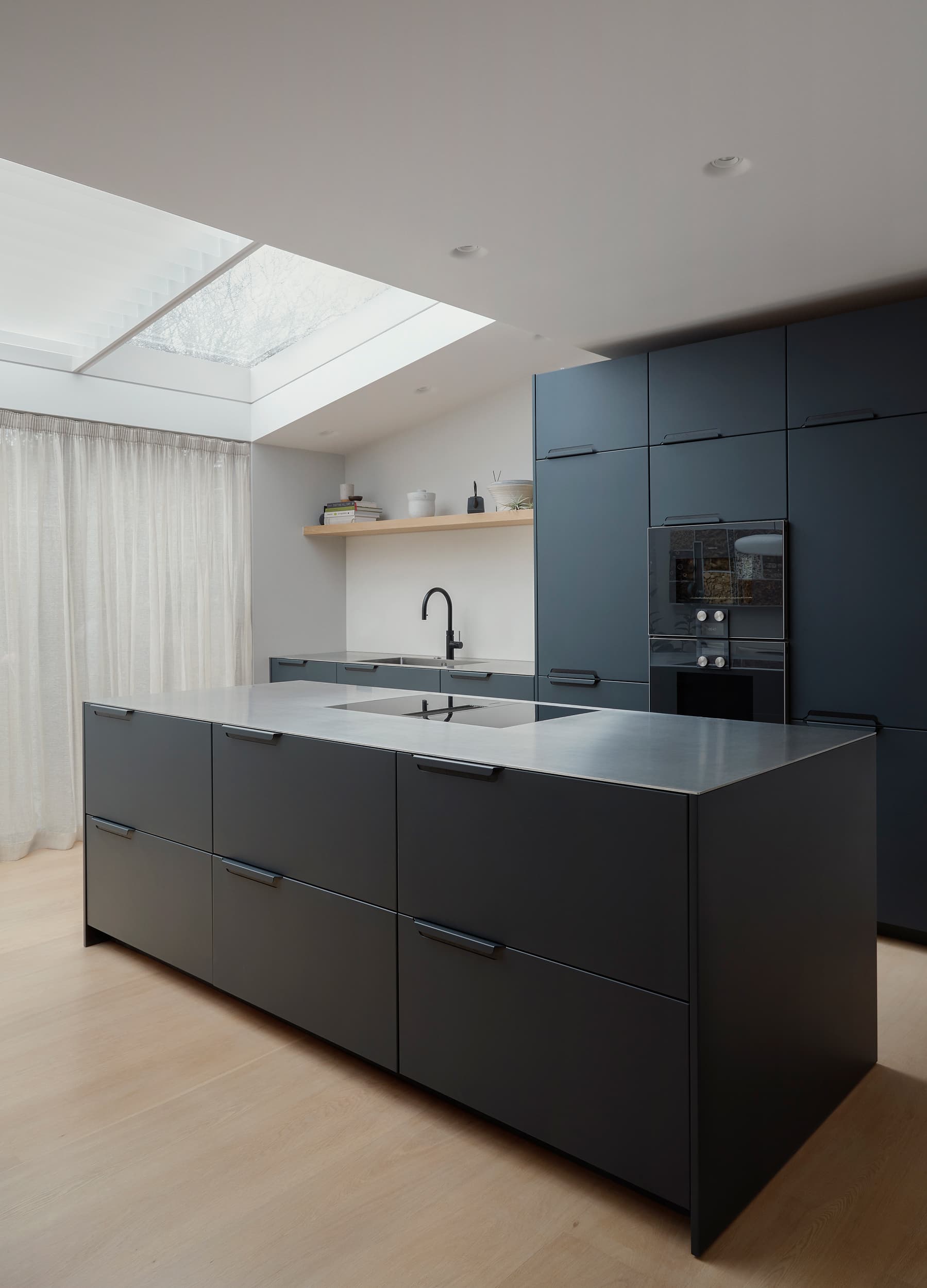 An exploration of raw materials was used to introduce subtle colour, including - oak, stainless steel and undyed linen. Bespoke joinery throughout the house articulates the spaces by bring functional and discreet storage to each room.