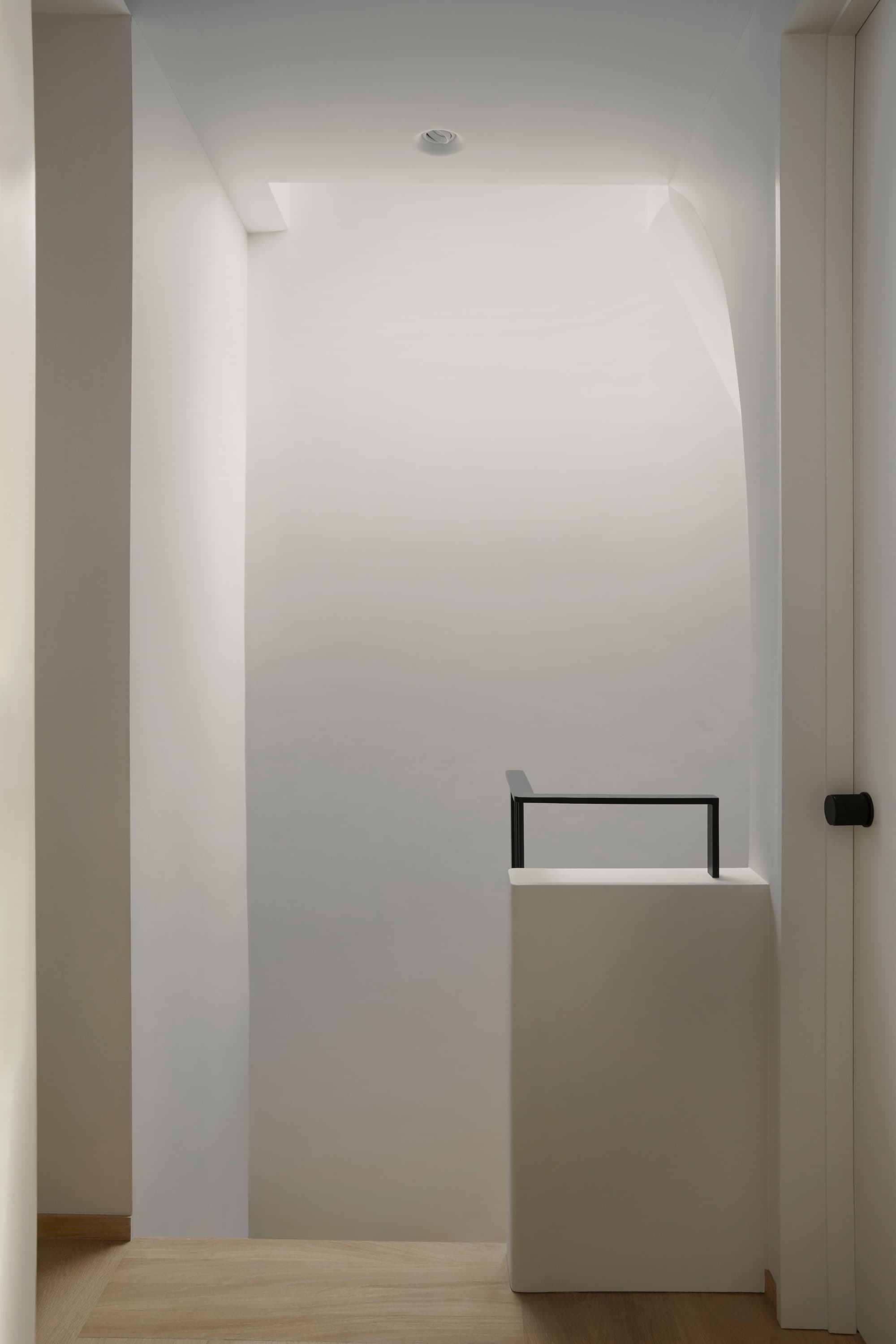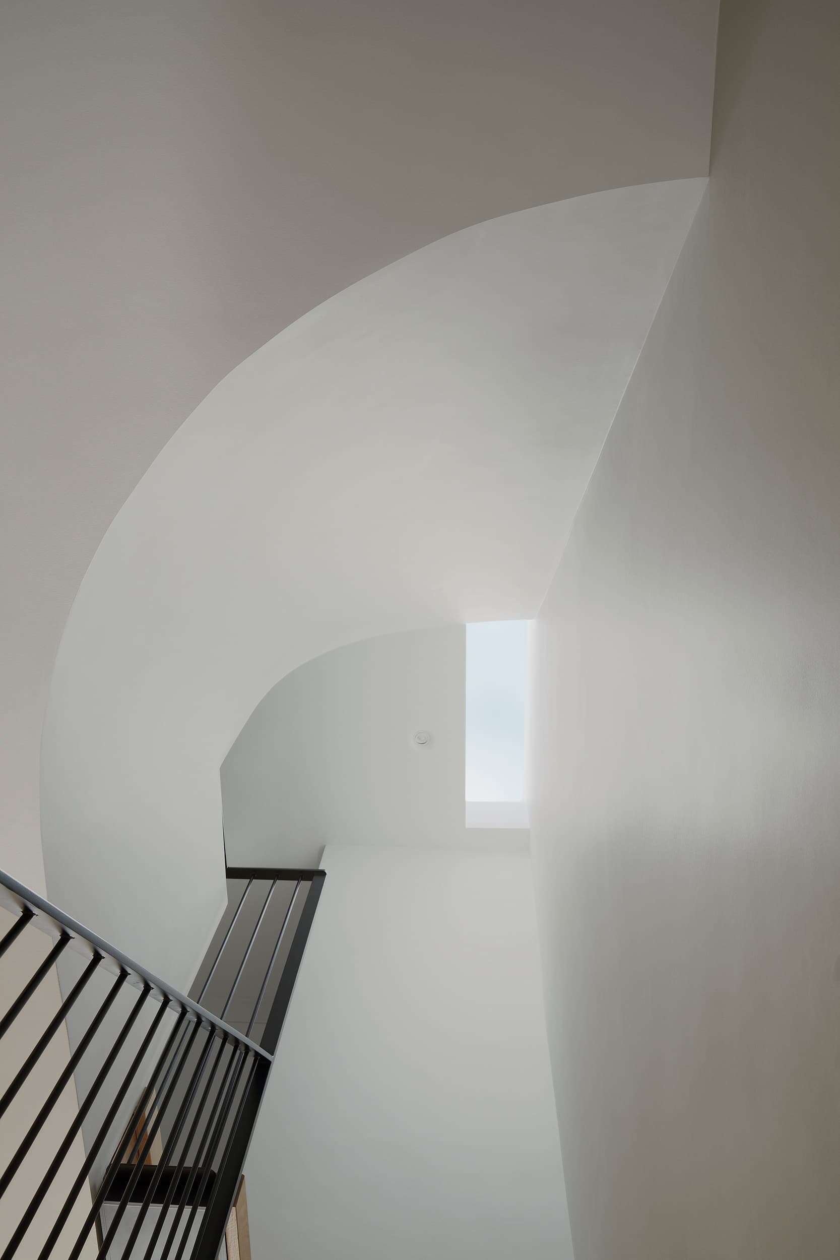 As part of a complete structural rethink of the interior space, the design repositioned the central stairwell to eliminate awkward, unusable areas from the hallway and landing. This found space created an opportunity to integrate an additional bathroom on the ground floor. A conical form cuts up into the roof, drawing in a wonderful quality of natural light into the centre of the house. Intersecting through the children’s bedroom, it creates a soft curve into an otherwise linear set of spaces.