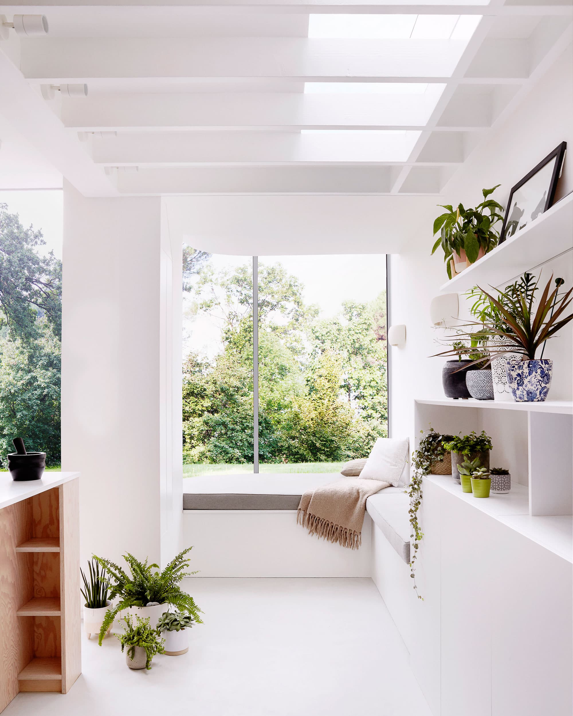 Contemporary materials were integrated throughout the period house to form unique living spaces. A curved stainless steel shower was projected from a two-storey extension, and an unusually deep bay window was added to the ground floor to create a rest and reading spot with a sweeping vista of the garden.