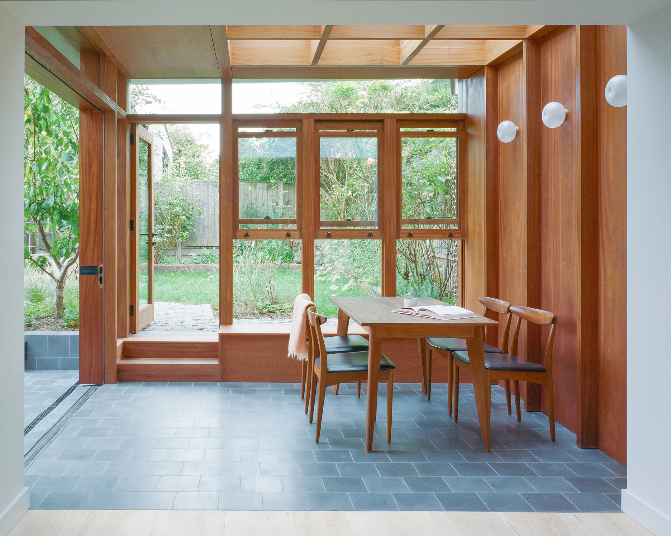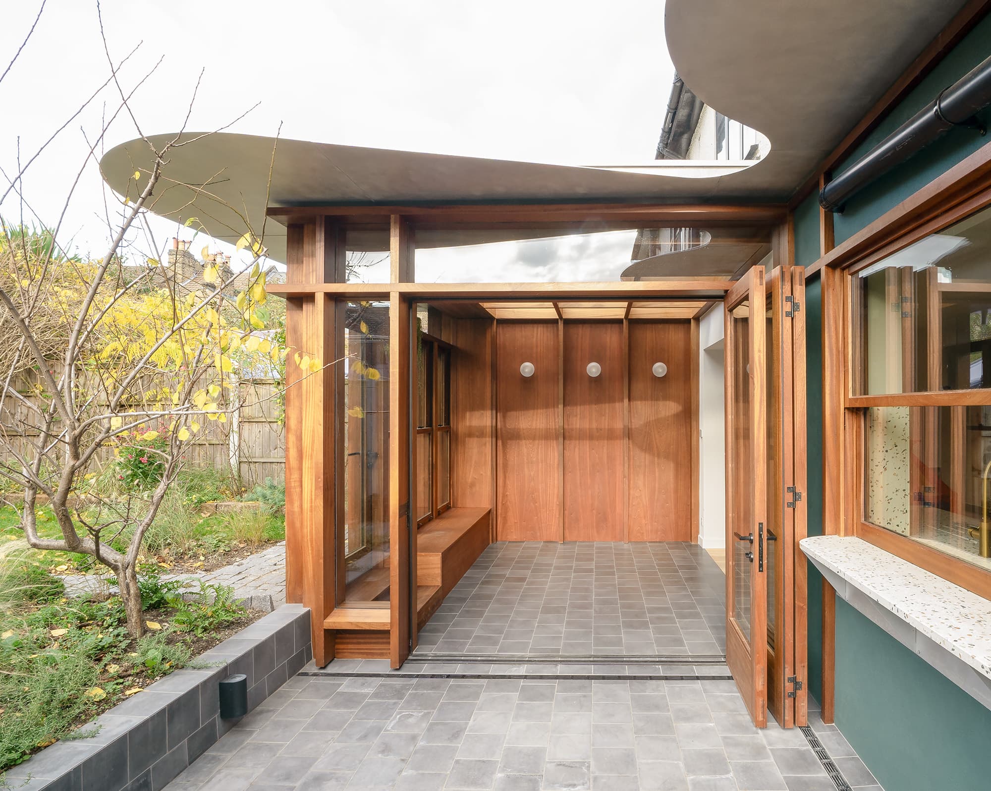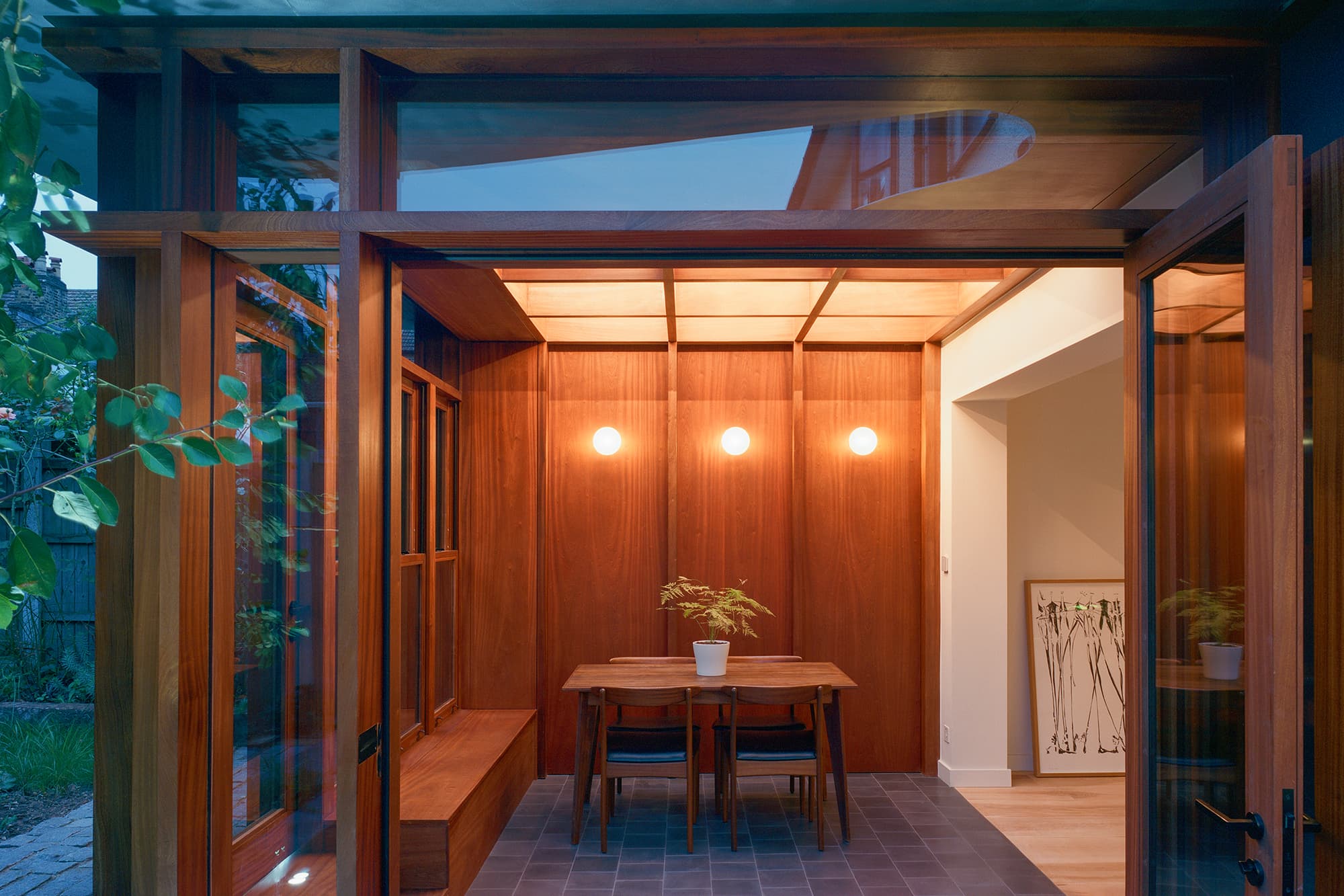Extensive glazing spanning the rear elevation allows leafy views to serve as a backdrop while a built-in bench seat provides the perfect reading spot beneath. Sapele wood joinery frames the space while an aluminium canopy above provides weather protection for the timber and mitigates solar heat gain within the extension.