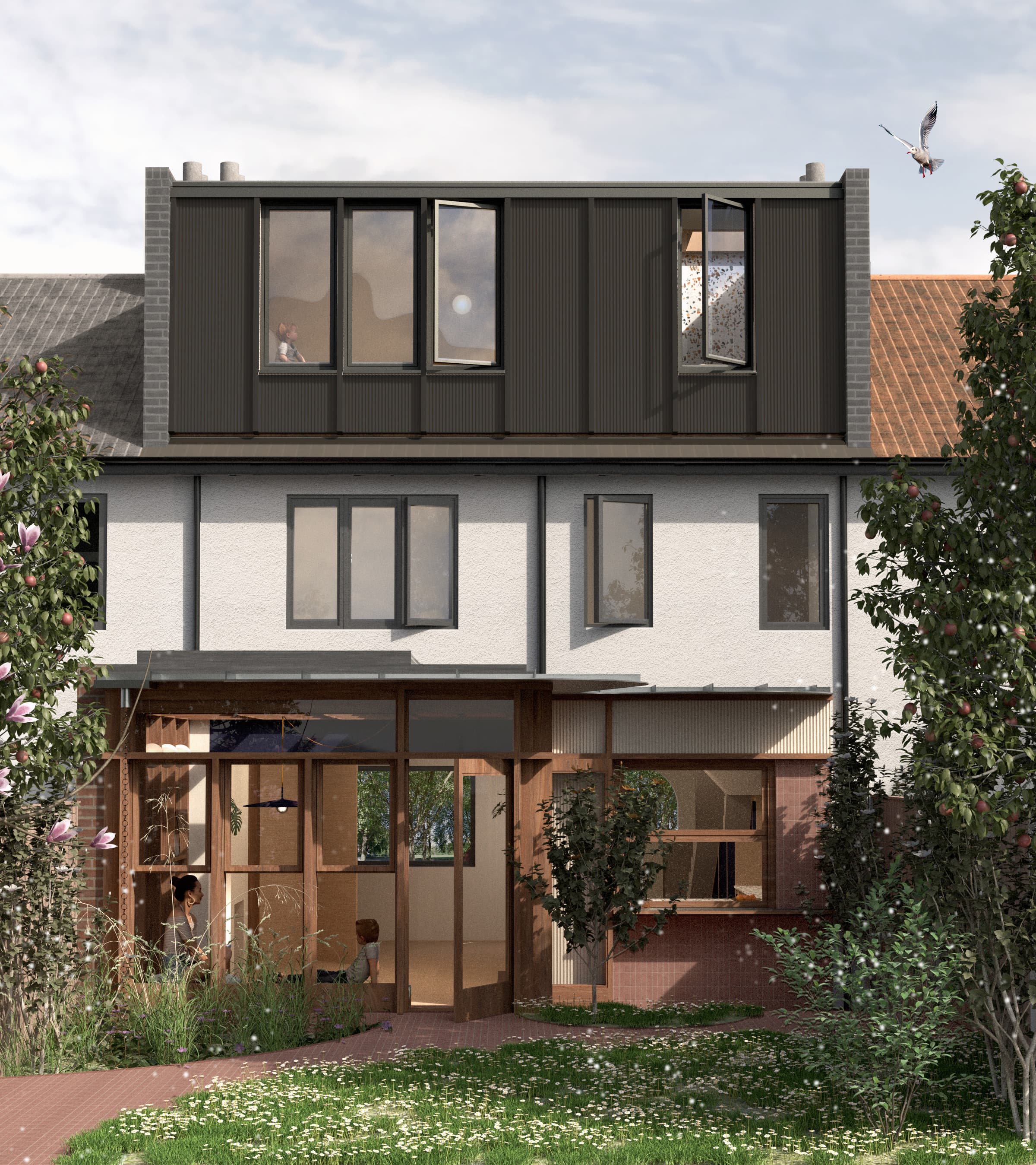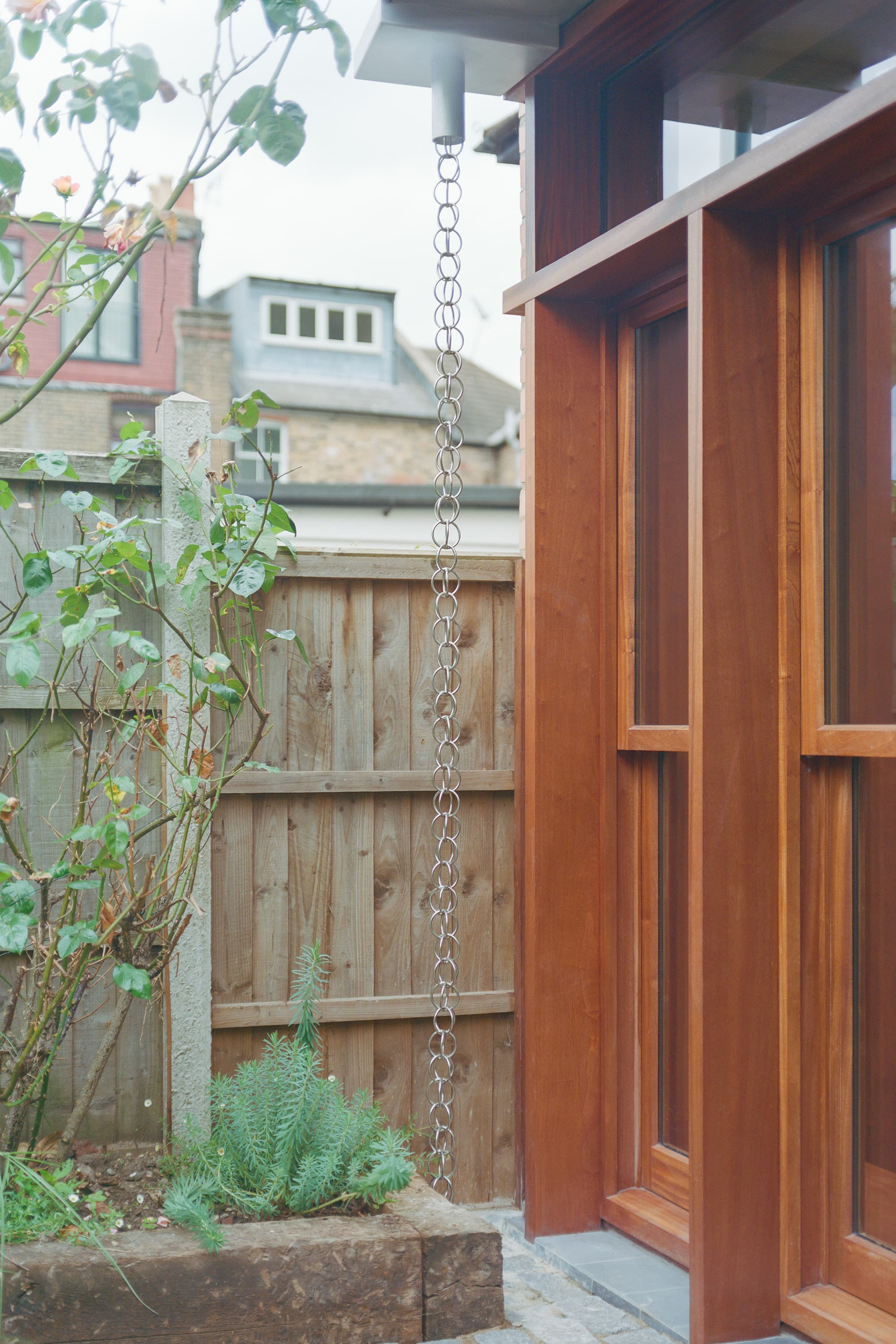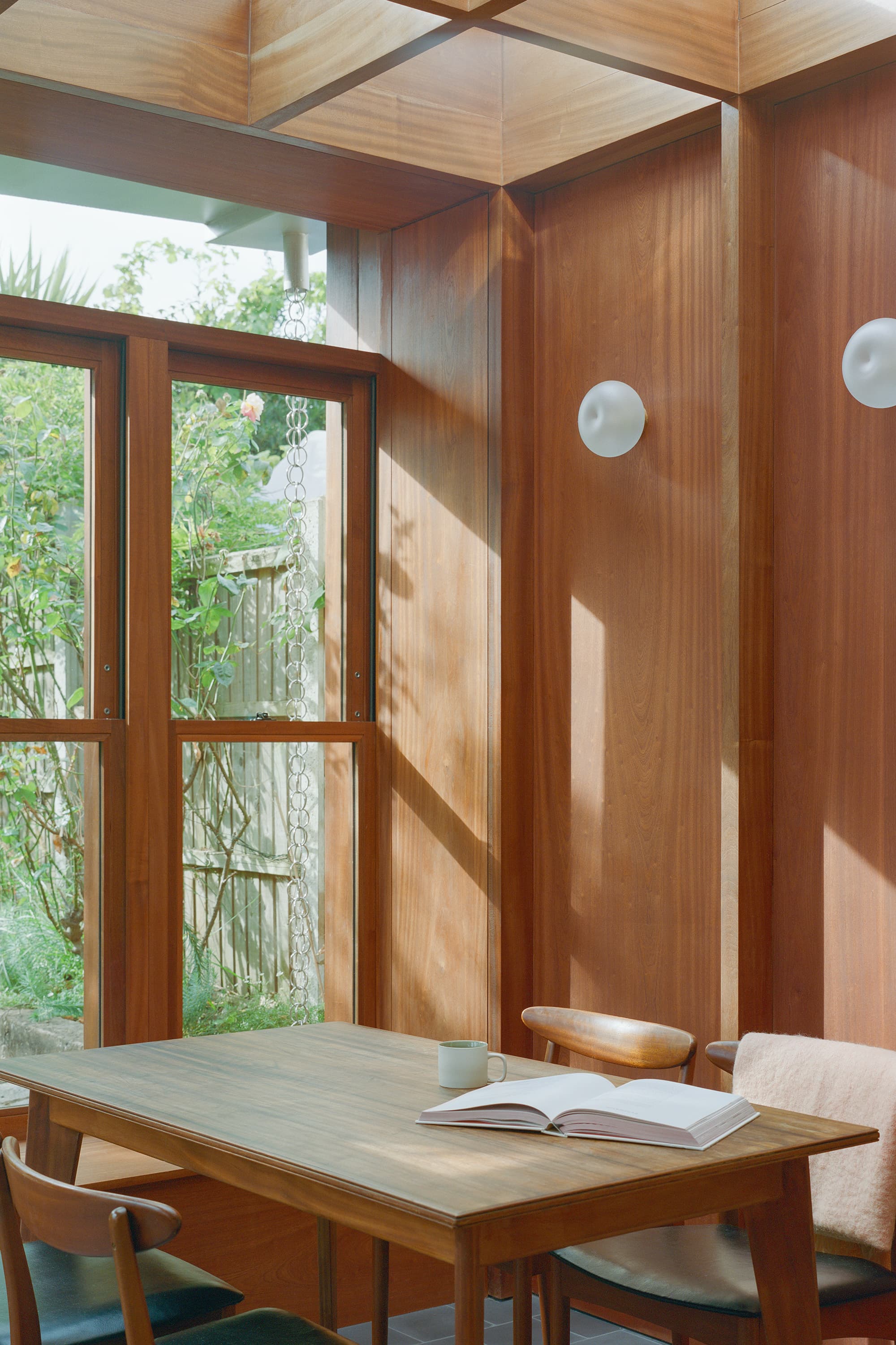 Extensive glazing spanning the rear elevation allows leafy views to serve as a backdrop while a built-in bench seat provides the perfect reading spot beneath. Sapele wood joinery frames the space while an aluminium canopy above provides weather protection for the timber and mitigates solar heat gain within the extension.