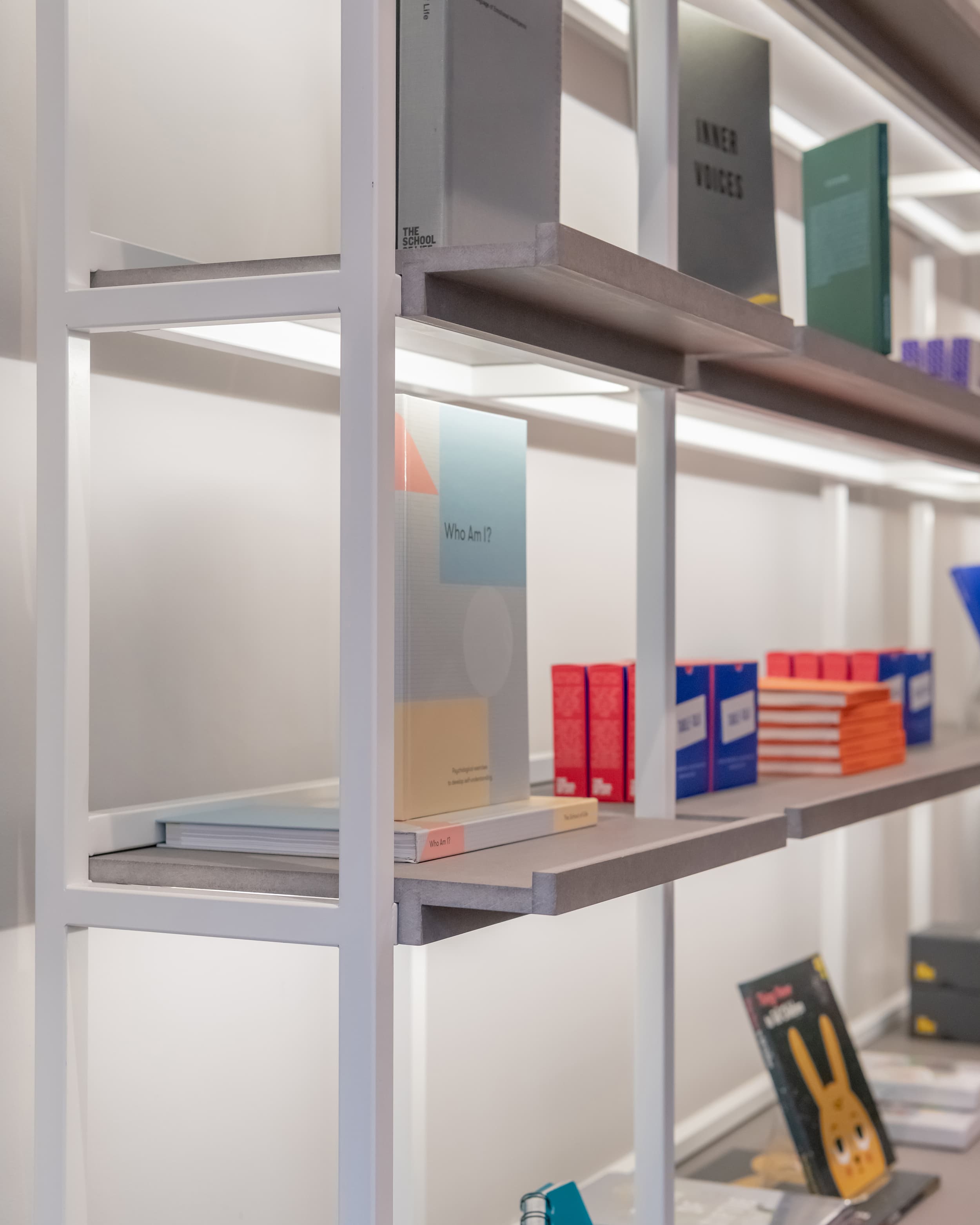 Our concept involved organising the store into six areas to reflect the different themes of the products, which were displayed on bespoke powder coated metal and grey valchromat shelves around the room. We drew inspiration from the complex tapestries of Anni Albers to interweave these six areas and bring them together onto a central table that would serve as a starting place for conversations in the space.